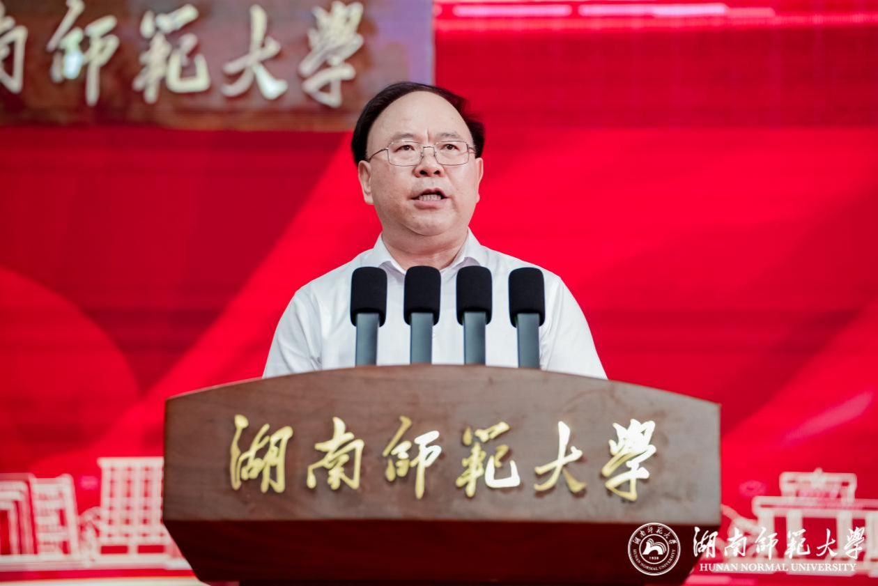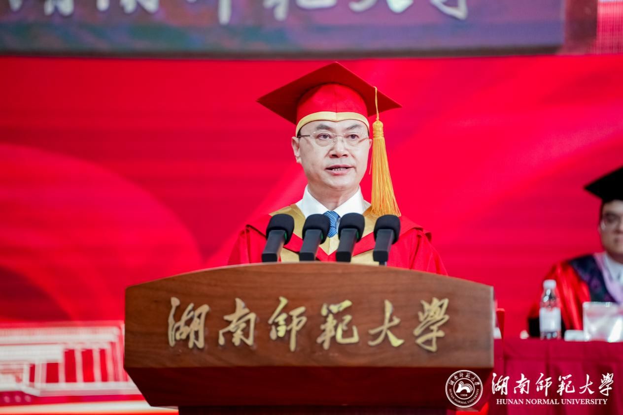 刘仲华校长讲话。他代表学校向圆满完成学业的2025届全体本科毕业生致以热烈祝贺,向所有关心、支持和帮助同学们成长成才的教职员工、亲友、校友和各界人士致以衷心感谢。他深情回顾了同学们在湖南师大与时代同频共振的成长轨迹。他强调,2025届毕业生们以青春为笔、奋斗为墨,共同交出了一份优异答卷。临别之际,他期望同学们要在时代浪潮中找准自我,以“大我”的格局勇担时代使命。要始终将个人成长与国家发展、民族复兴紧密相连,在时代的浪潮中找准航向,勇担使命,以青春热血为国家社会贡献力量;要在开拓创新中超越自我,以“超我”的韧劲勇攀事业高峰。全体师大学子要保持对未知的期待,对创新的热情,在未来赛道上勇毅前行;要在磨炼考验中坚守自我,以“真我”的姿态勇书人生华章。希望全体毕业生坚守自我,明辨是非、恪守底线,寻得心灵的自足与自洽。