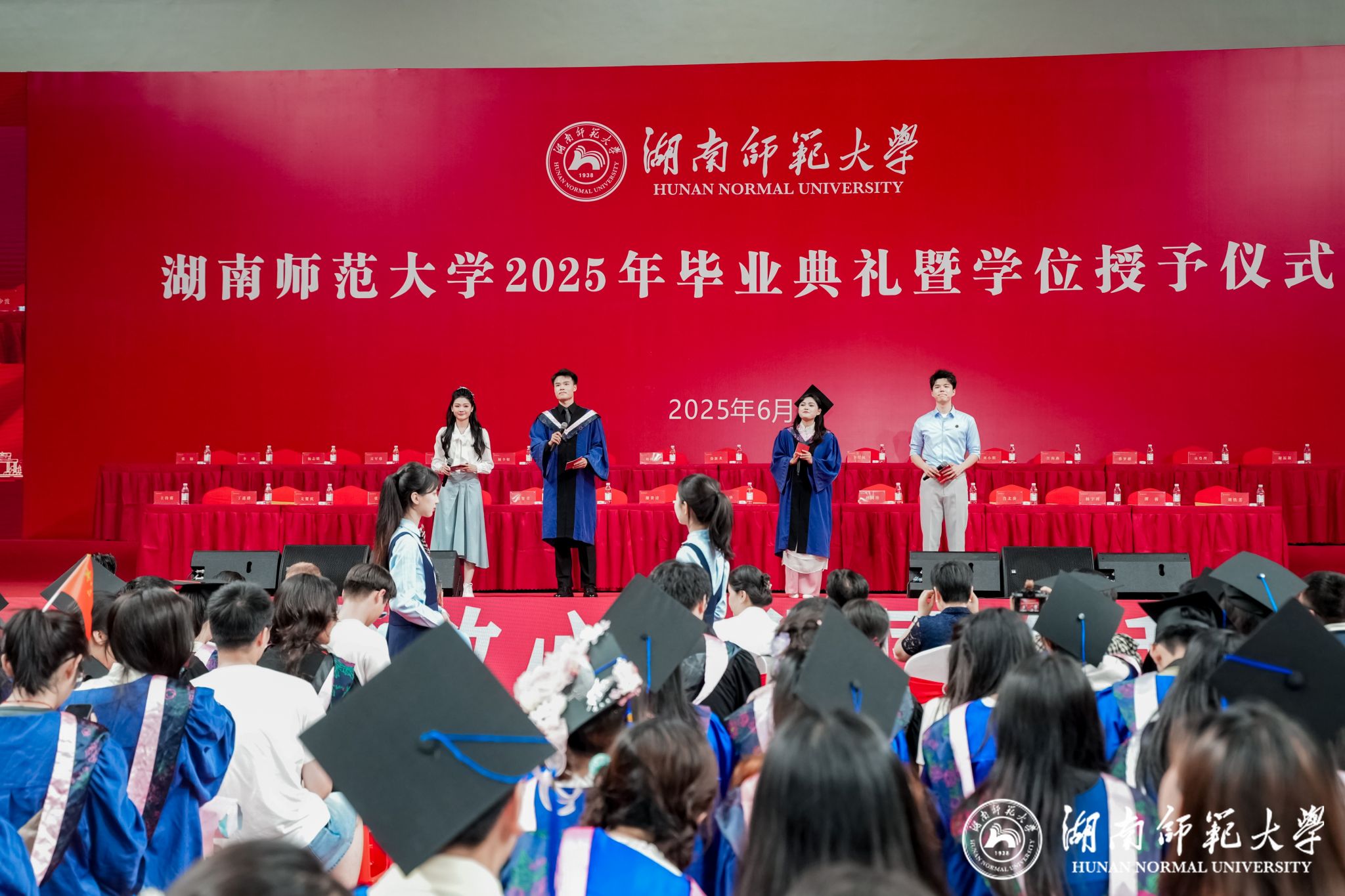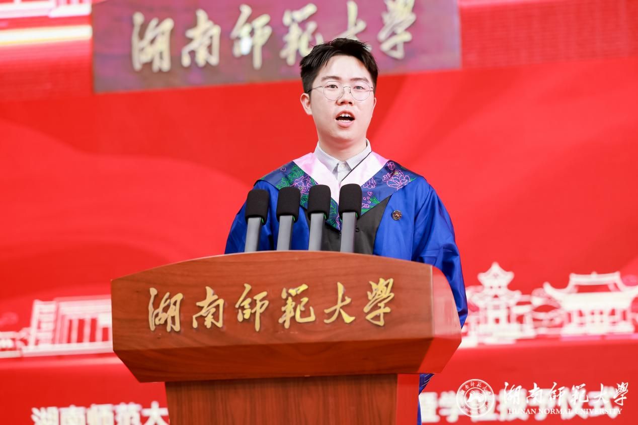 文学院硕士毕业生邓郭欢作为毕业生代表发言。他回望初入麓山路时的懵懂,读研期间论文攻坚的日夜、实习路上的奔波,都是青春的独特印记。他表示,未来将牢记师大人的身份,传承校训精神,躬耕平凡,不负母校栽培。