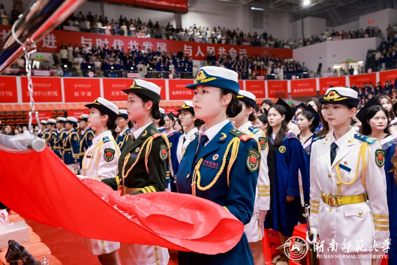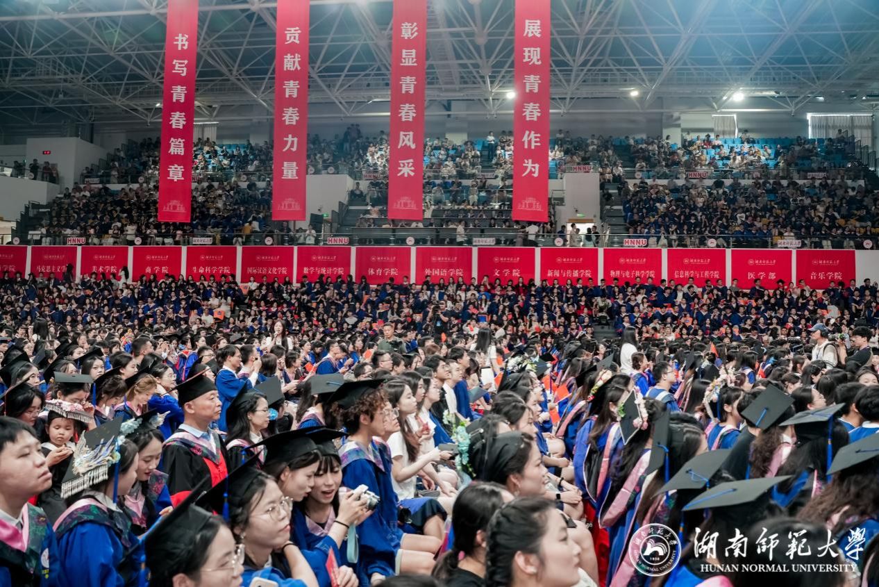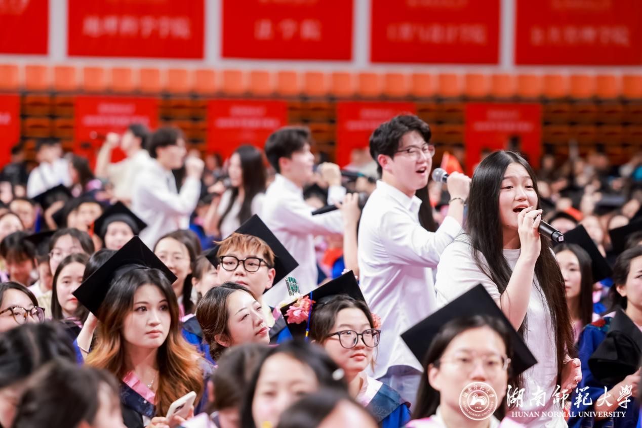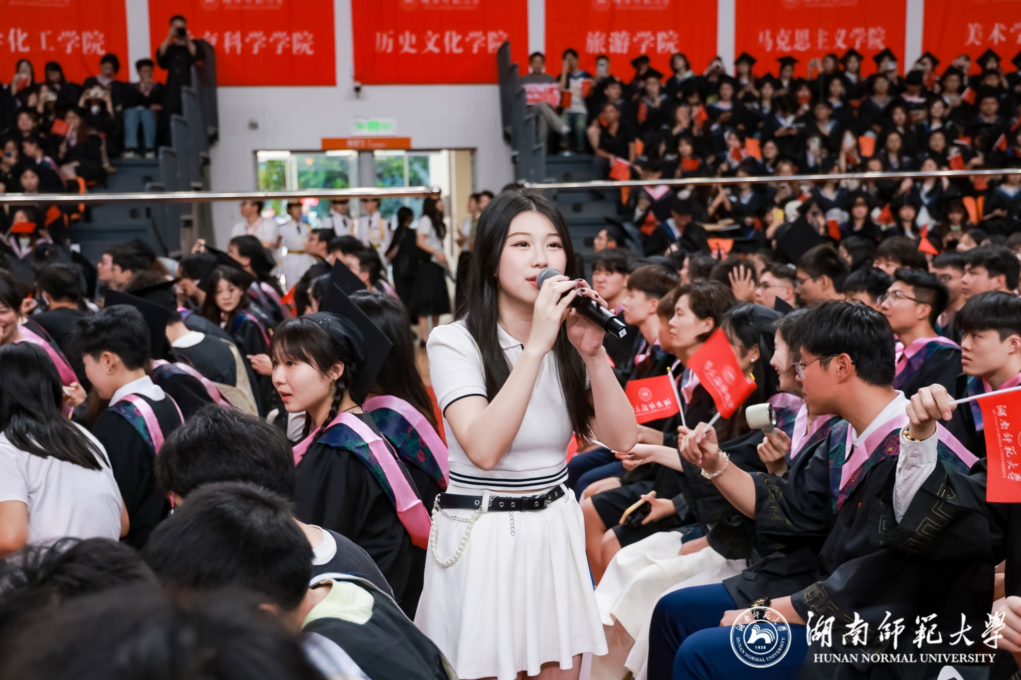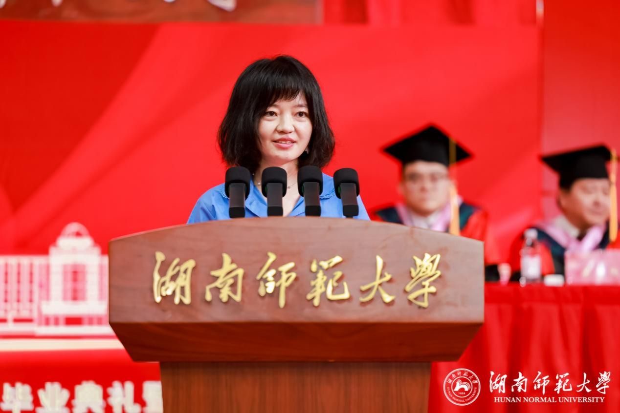 世承书院本科毕业生朱唐佳瑶作为本科毕业生代表发言,她深情讲述了自己在岳麓山下的求学时光,表达了对母校、对老师的感激与不舍之情,并呼吁同学们永远争做具有“仁爱精勤”底色的湖南师大人。